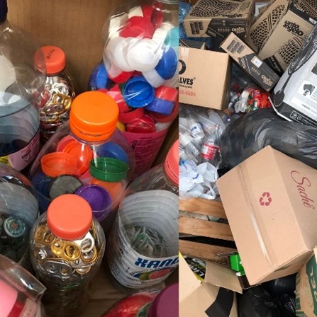Os materiais coletados em nossa instituição são: pilhas, baterias, óleo de cozinha usado, lacres de latinhas e tampinhas de garrafa PET.